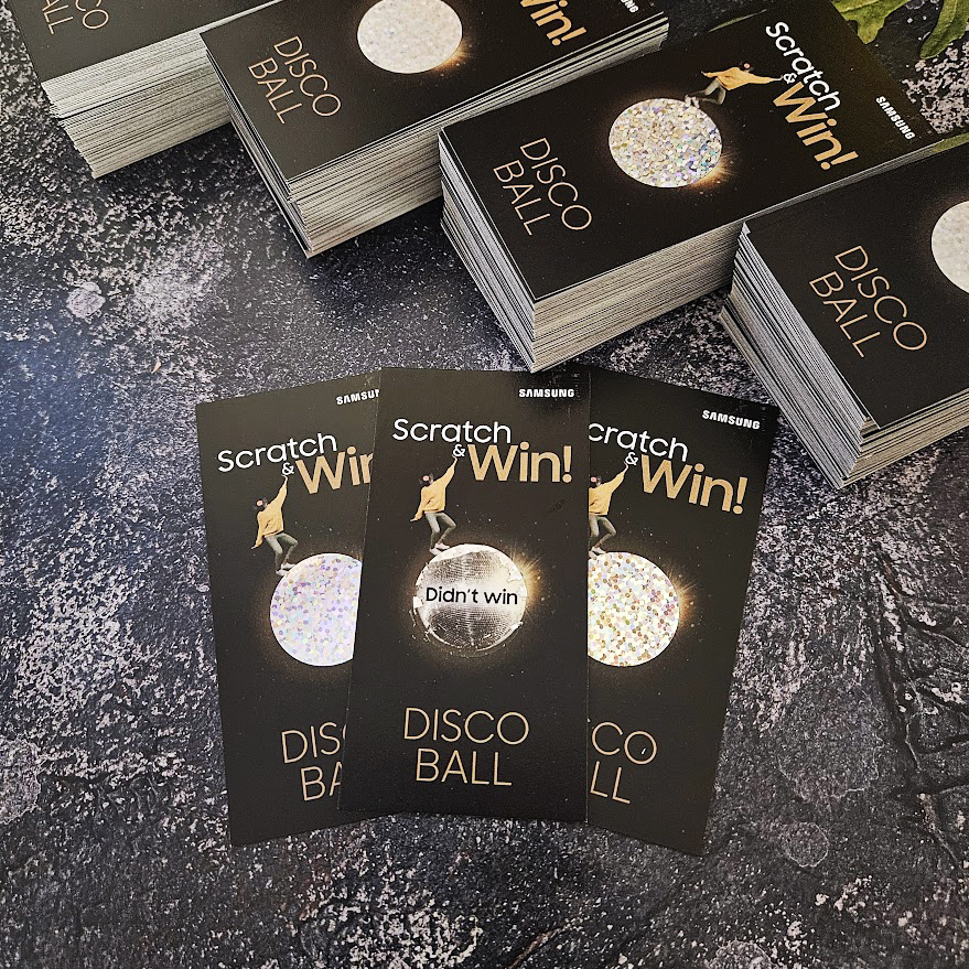 Partner reklámügynökségünk megkeresésére egy exkluzív eseményhez készítettünk egyedi kaparós sorsjegyeket, ahol szakmai javaslatunkra a grafika diszkógömb tematikájához illeszkedő, különleges hologramos kaparófelületet alkalmaztunk. A fénytörő réteg nemcsak látványos vizuális élményt nyújt, hanem prémium megjelenést kölcsönöz a promóciónak, garantáltan megragadva a látogatók figyelmét a rendezvényen.