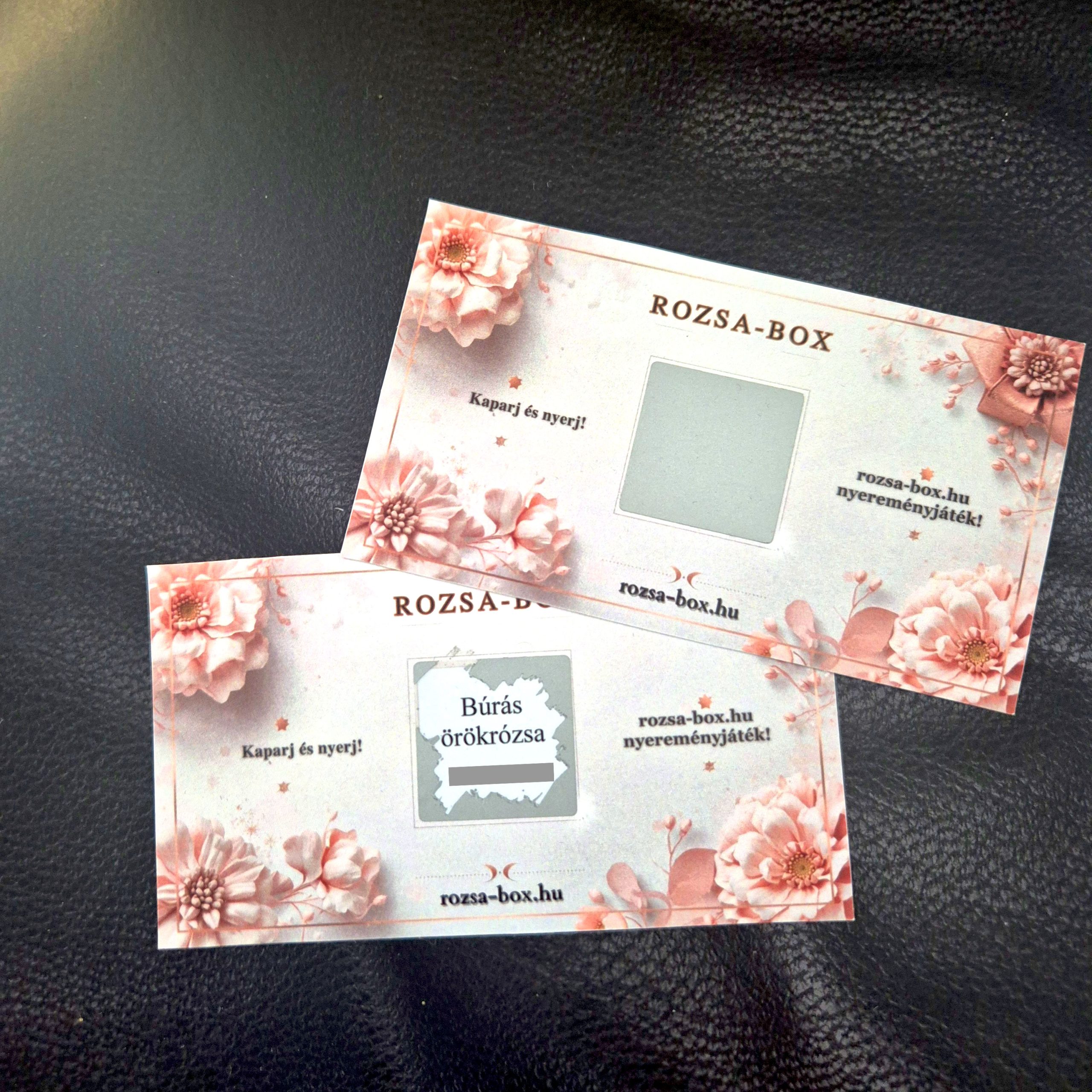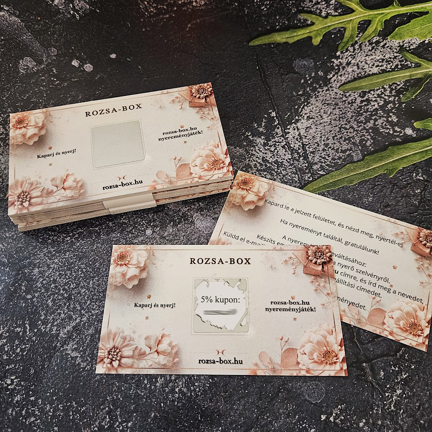 Vásárlásösztönző kuponkártyák webshop részére. Online áruház számára kétoldalas, prémium kivitelű kaparós kuponokat készítettünk, amelyeket a webshop vásárlói között osztottak szét marketingaktivitás keretében. A sorsjegyek célja az ügyfélelégedettség növelése és a visszatérő vásárlások ösztönzése volt egyedi kedvezmények felkínálásával. A kétoldalas kialakítás lehetővé tette, hogy a kaparós rész mellett elegendő hely maradjon a webshop arculati elemeinek és a beváltási feltételek pontos feltüntetésének is.