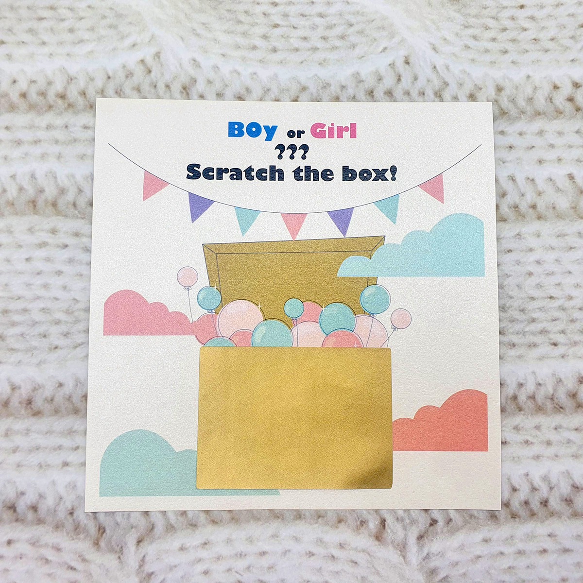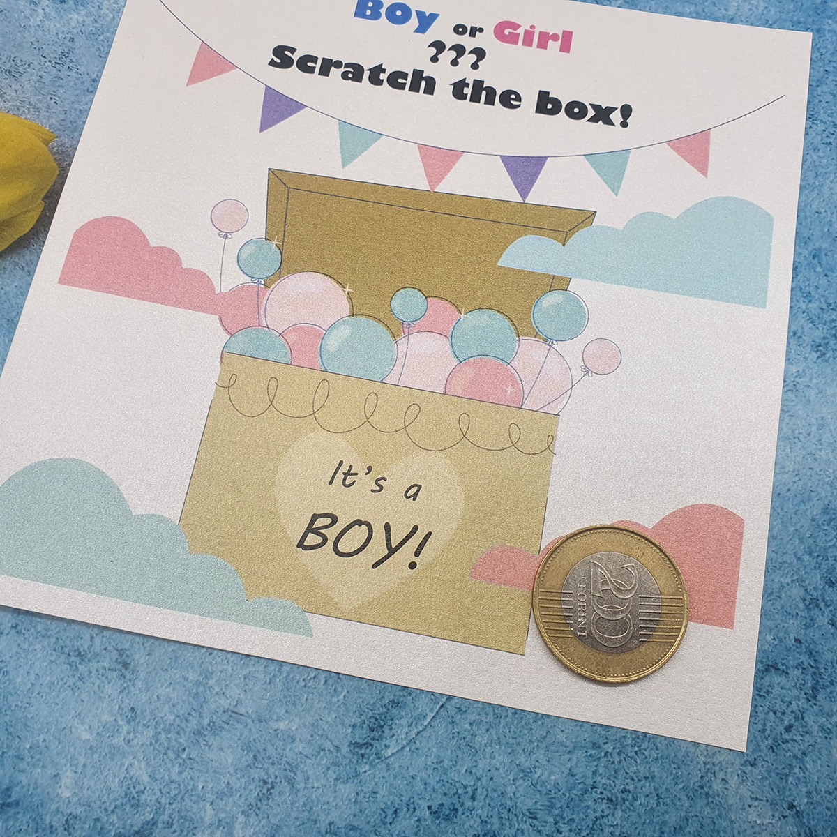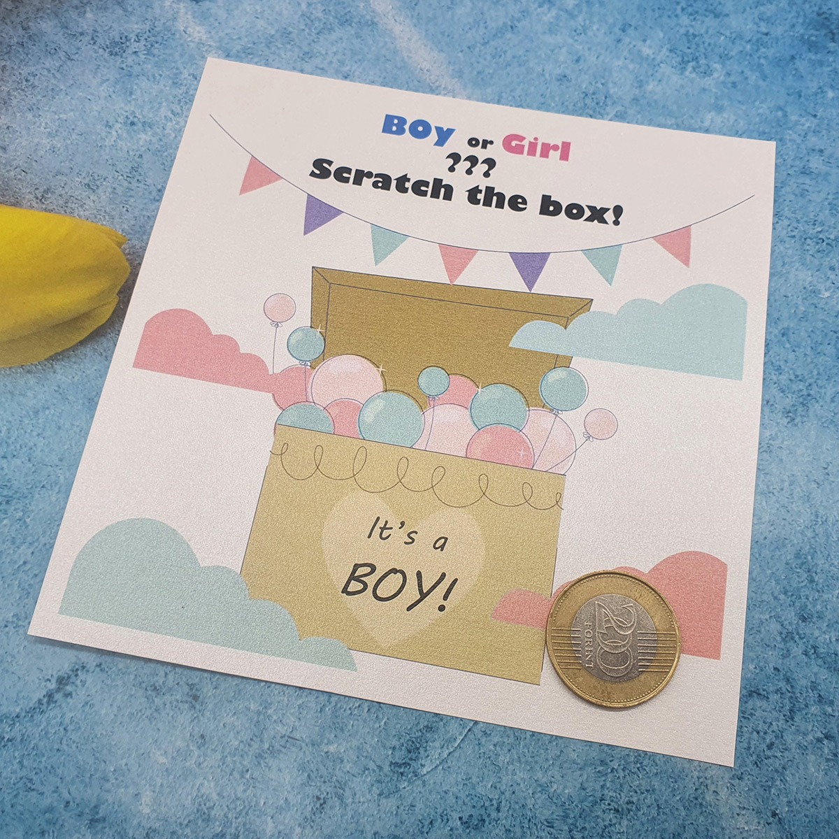 🕹️ Hogyan működik a leleplezés? Ez a típusú sorsjegy interaktív játékot kínál: a családtagok vagy barátok lekaparhatják a kaparós mezőt, amely alatt feltárul az igazság. Ha már a baba neve is megvan, kérhetitek dupla meglepetéssel is: így a baba neme és a neve egyszerre derülhet ki a családi összejövetelen!✨