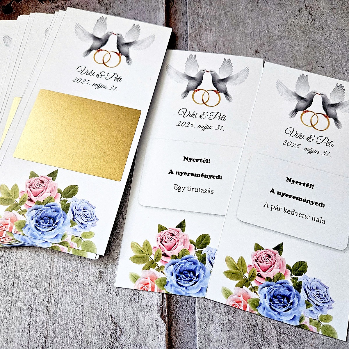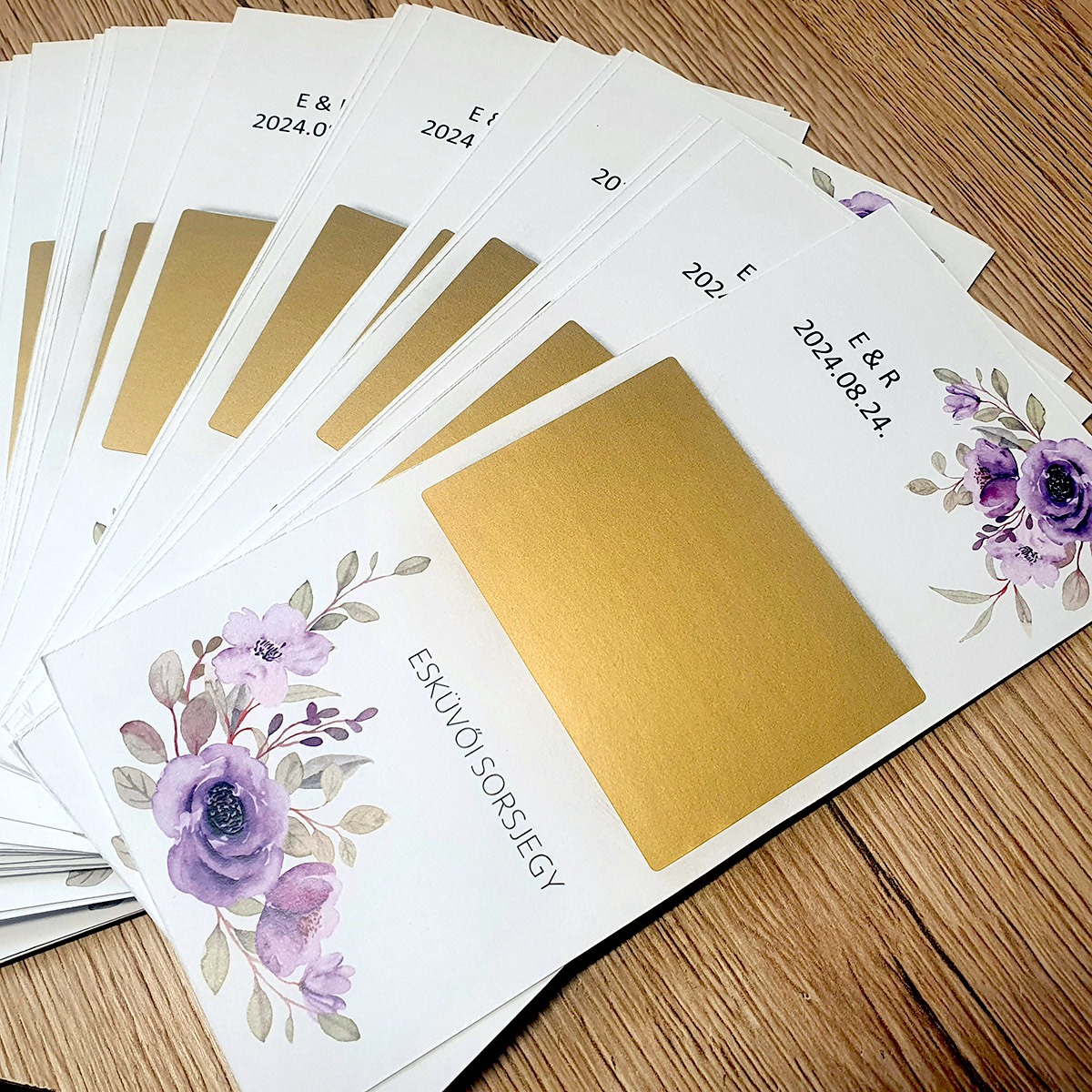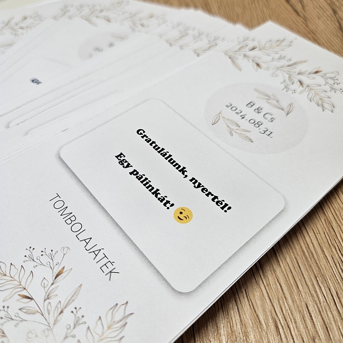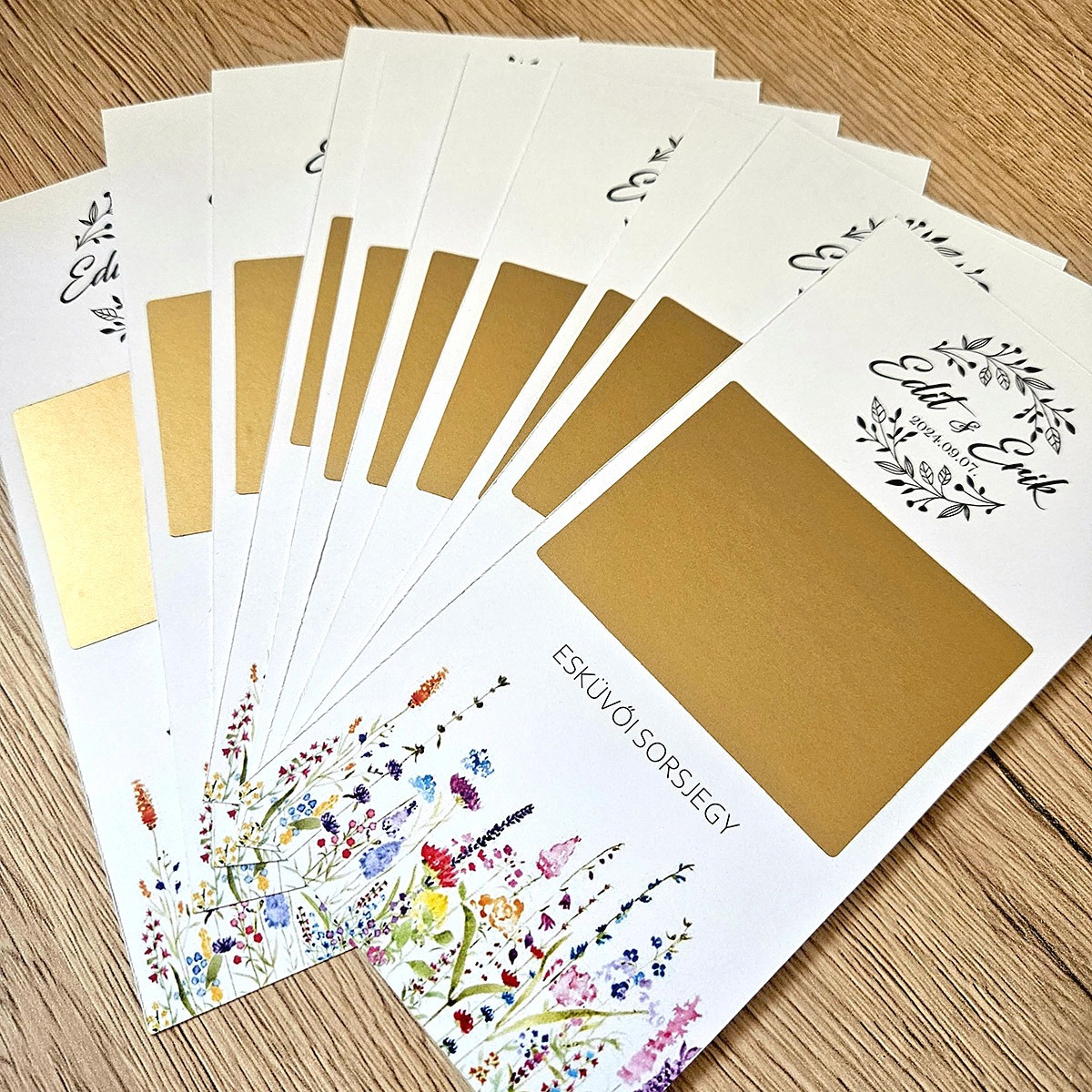 Teljesen egyedi grafika: Nem sablonokkal dolgozunk. A sorsjegyek színeit és motívumait az esküvőtök dekorációjához vagy akár a közös hobbitokhoz igazítjuk – ráadásul a grafikai módosítás nálunk ingyenes! 🎨