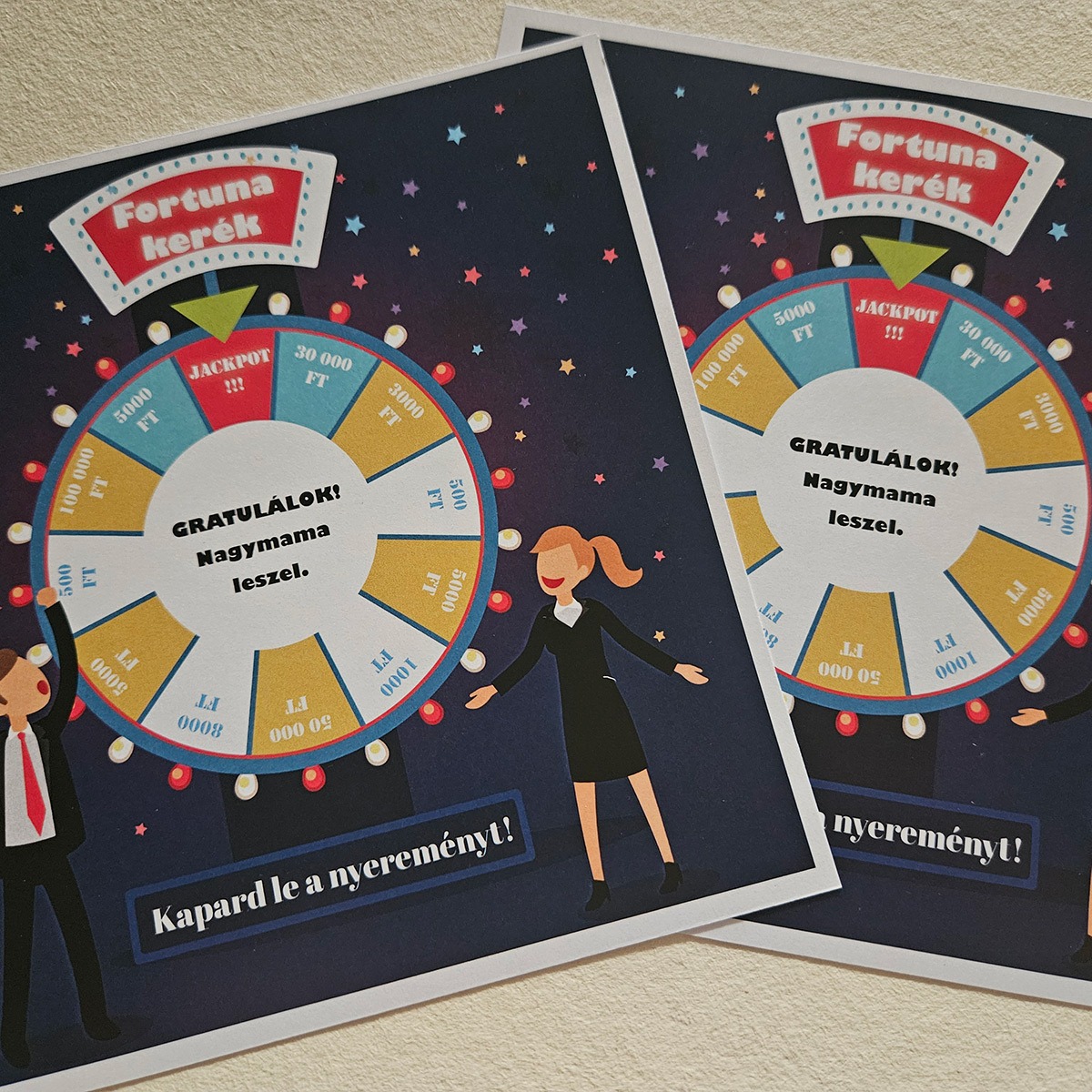 Exkluzív megjelenés: Háromféle kaparós felület (arany, ezüst, hologramos) közül választhatsz, hogy a sorsjegy tényleg prémium hatást keltsen.