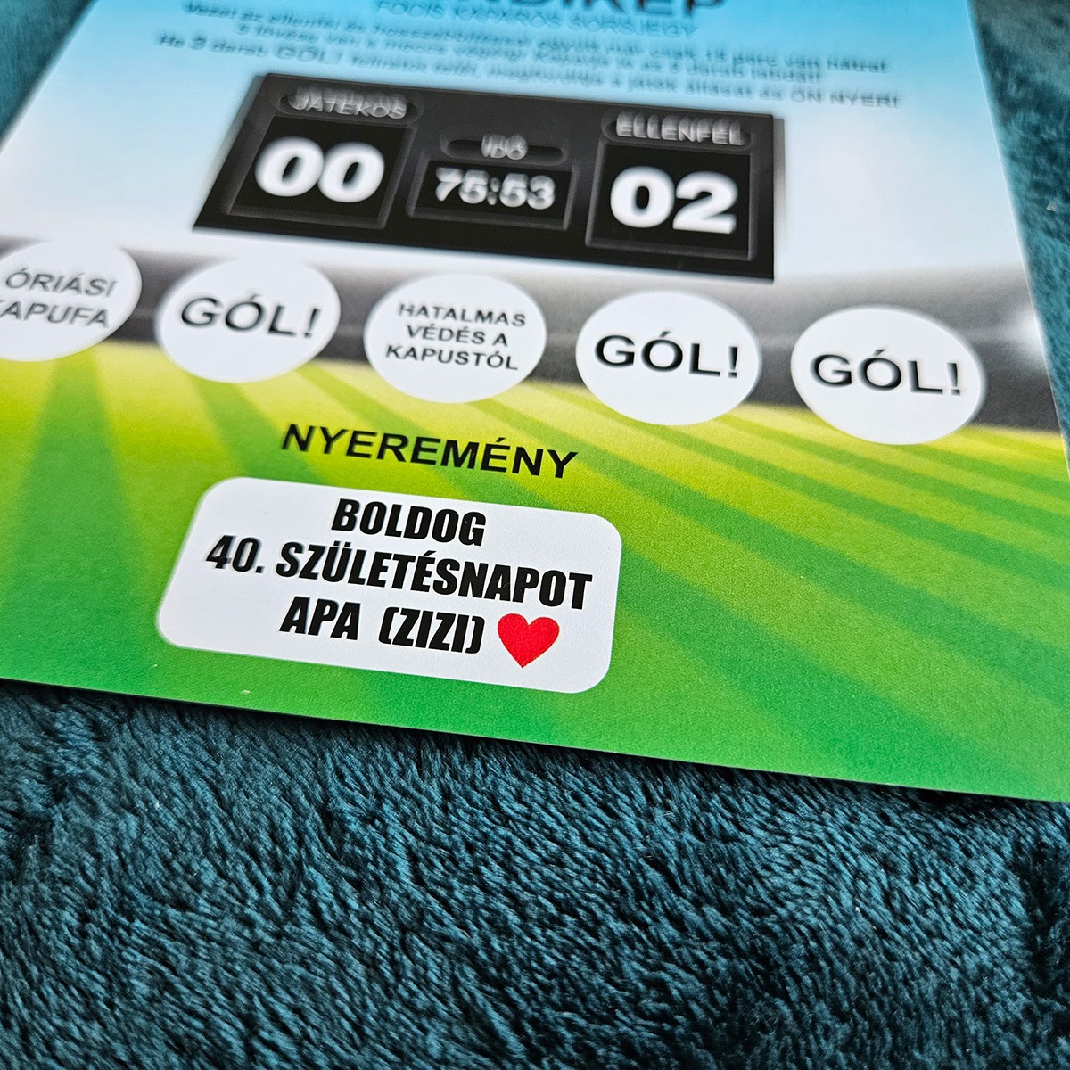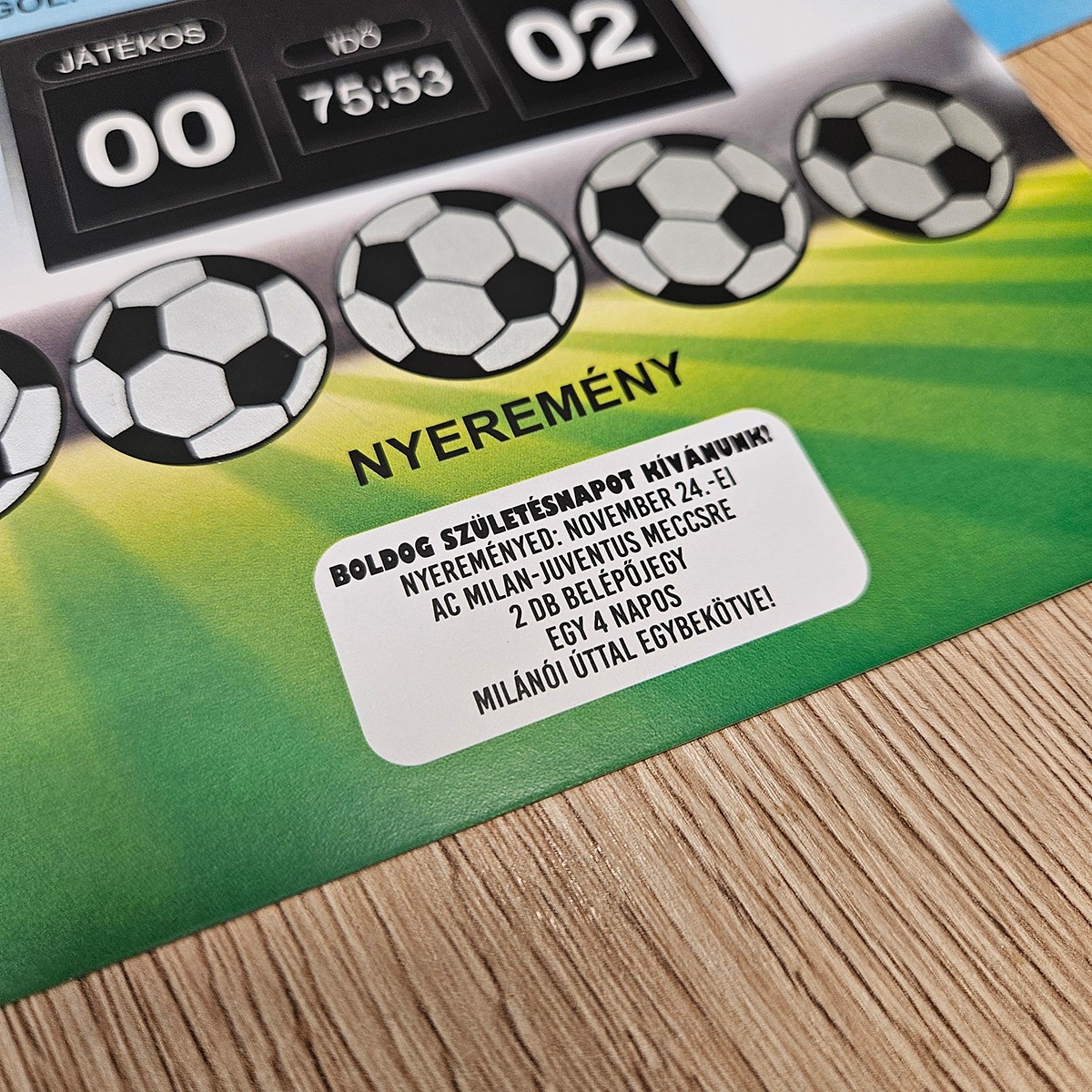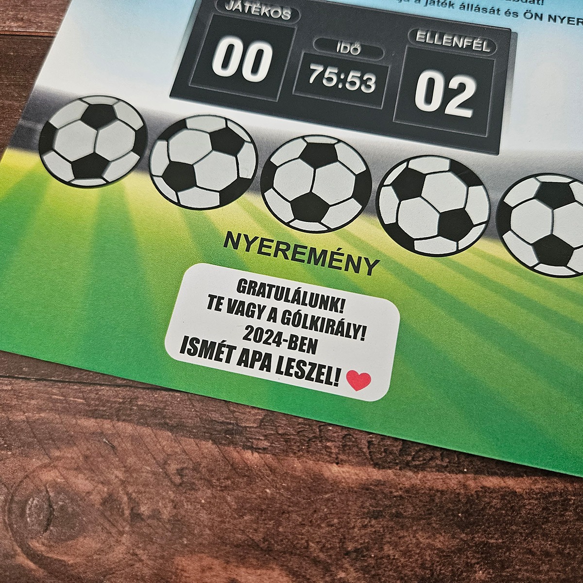 🕹️ Hogyan működik a játék? A szituáció éles: az ellenfél már 2 találattal vezet. Az ajándékozott feladata, hogy a focilabda mintás kaparós mezők alatt megtalálja a 3 darab GÓL! feliratot. Amint ez megvan, a meccset megnyerte, és jöhet a jutalom! A valódi nyeremény az alul található hologramos felület alatt rejtőzik, ahol az általad megadott személyes üzenet várja a győztest.