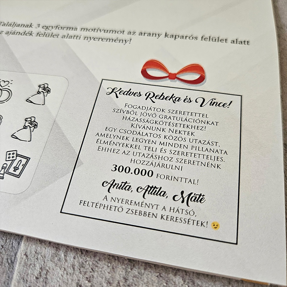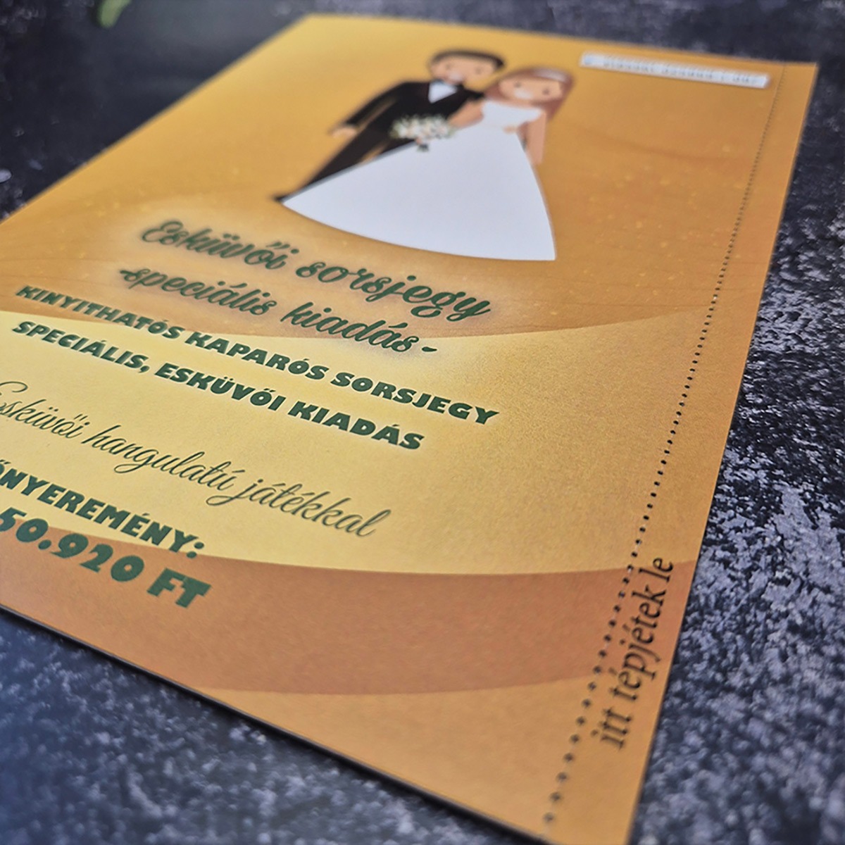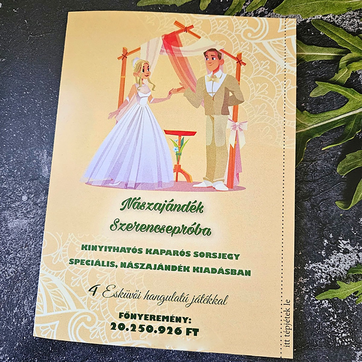 Felejtsd el az unalmas, fehér borítékokat! Ha valami igazán kreatívval rukkolnál elő egy esküvőn, kerek születésnapon vagy ballagáson, ez az A4-es méretű, kinyitható óriás sorsjegy lesz a legjobb választásod. Ez a különleges, kézzel készített technika és a valósághű kaparós felület kombinációja – olyasmi, amit csak nálunk találsz meg! 🎫✨
