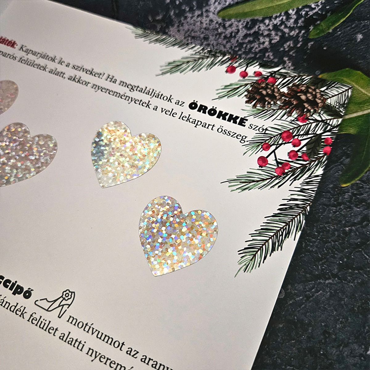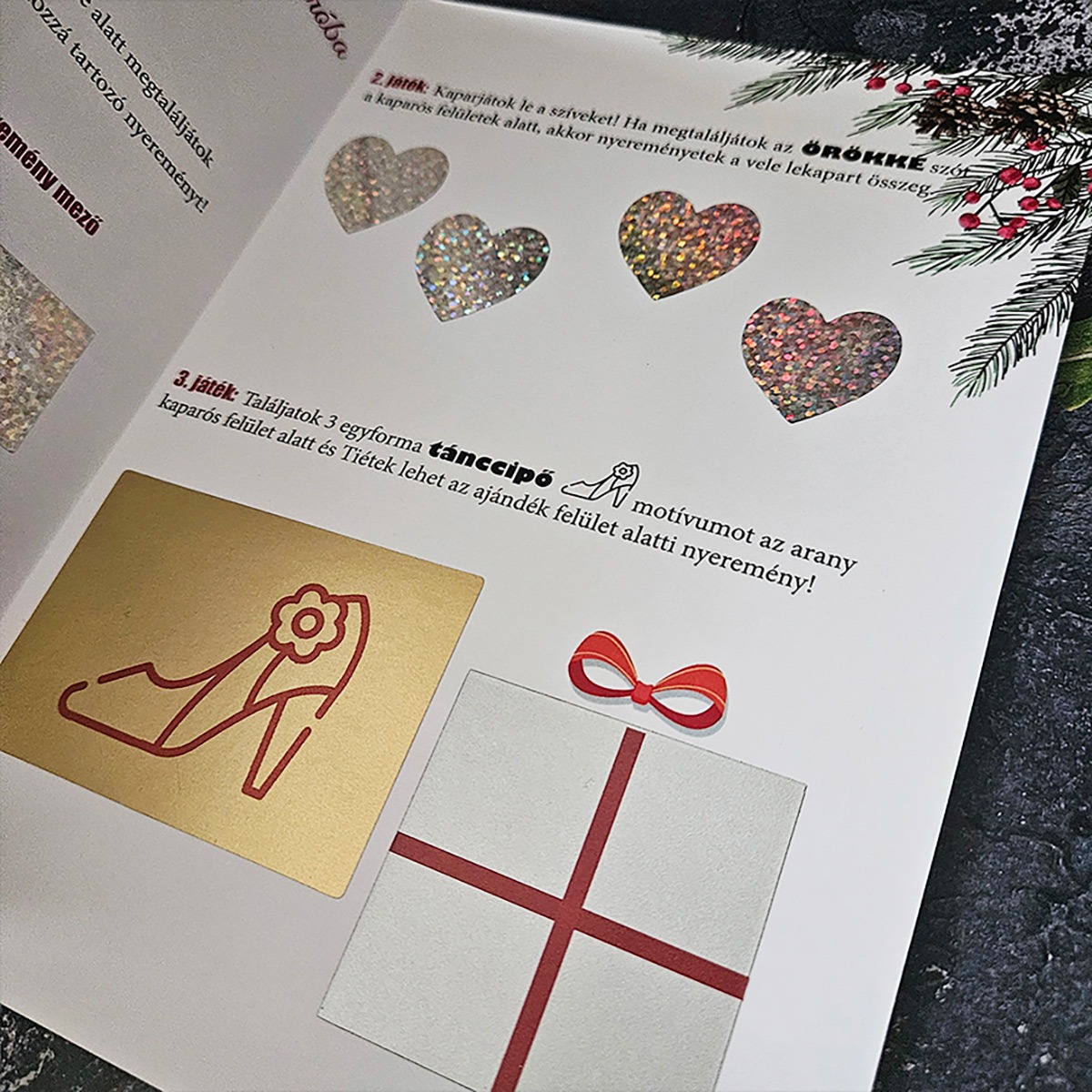 • 🕵️‍♂️ Interaktív nyitás: Az ünnepeltnek először a perforáció mentén fel kell nyitnia a szelvényt, hogy hozzáférjen a belső részbe rejtett 3 különböző játékhoz.