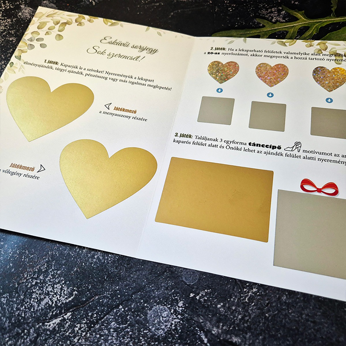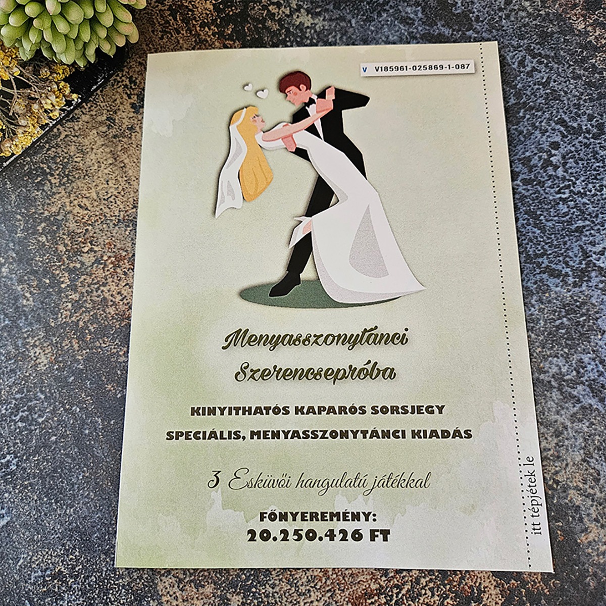 Szeretnéd, ha a nászajándékod lenne az ajándékozás legemlékezetesebb pillanata? 👰🤵 A Menyasszonytánci Szerencsepróba nem egy sima sorsjegy: a perforált szélek letépése után válik kinyithatóvá, feltárva 3 különböző, esküvői hangulatú játékot. 🎫✨ Tökéletes megoldás a nászajándékba szánt összeg stílusos és izgalmas átadásához. A grafikát, a dátumokat és a titkos üzeneteket is teljesen a párhoz igazítjuk, így garantált az elérzékenyülés és a hatalmas meglepetés! 🥂🎁