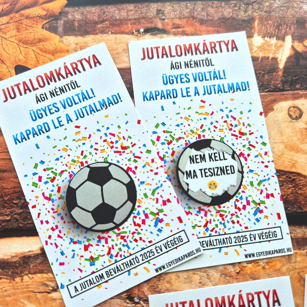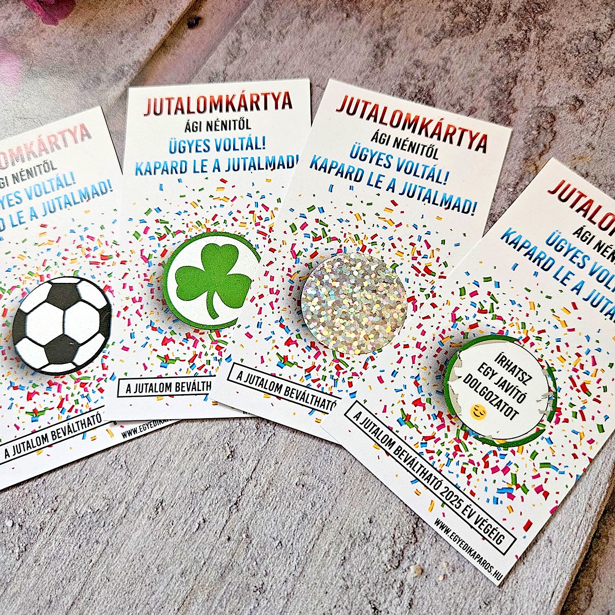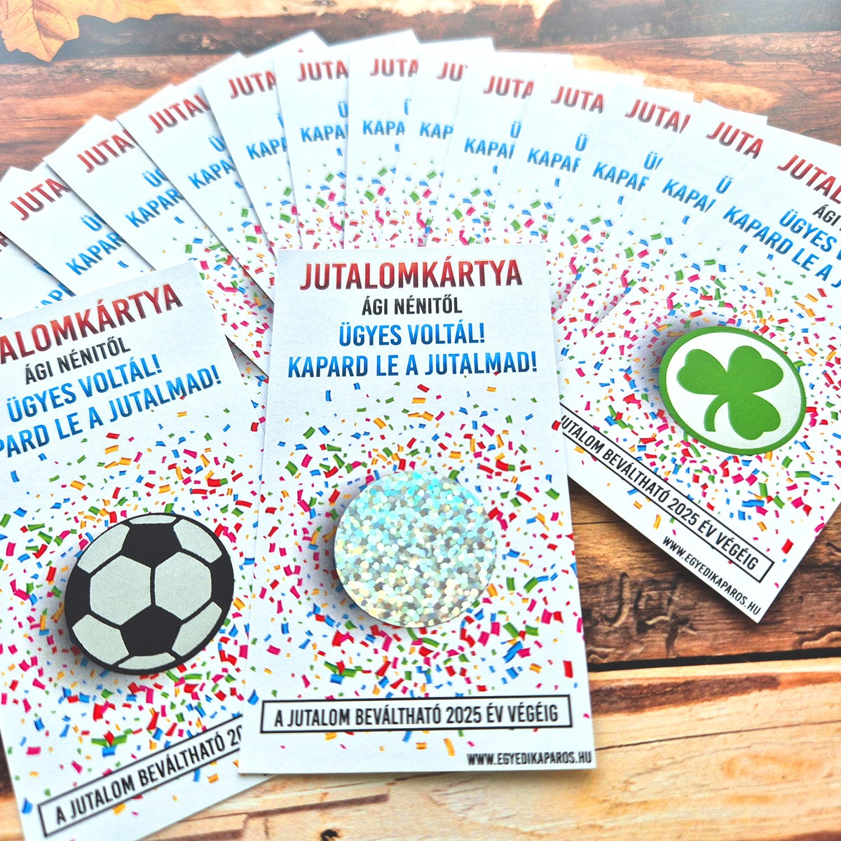 • 3 különleges kivitel: Választhatsz focilabdás, szerencsét hozó lóherés, vagy elegáns hologramosan csillogó (kör vagy téglalap) kaparós réteget. ⚽🍀✨