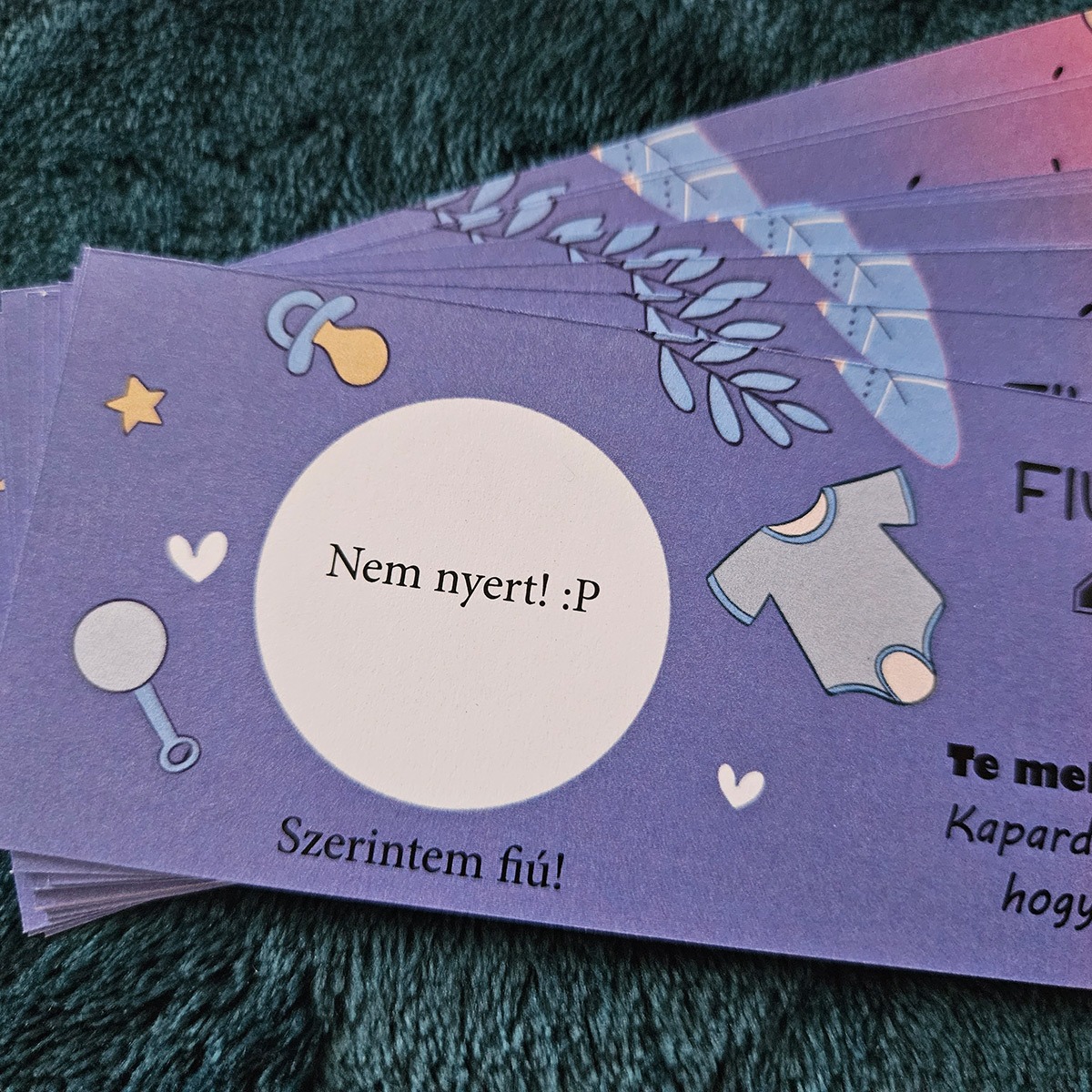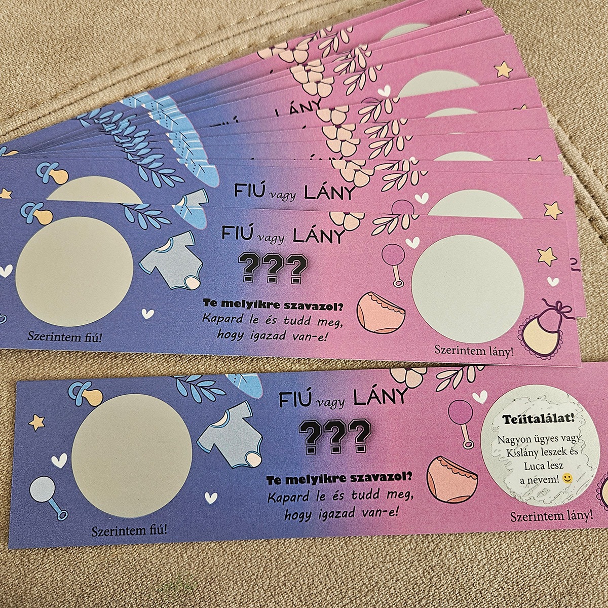 Kreatív ajándék, ha valami különlegessel rukkolnál elő. Ez a Tippelek baba nembejelentő kaparós, egyedi nyeremény résszel, valamint a kínálatunk további tagjai, mindig egy adu ász lesz a kezedben. Kínálatunk széles, számos grafikával, különböző kivitelekben kapható, hogy mindenkinek személyre szabott, hozzá illő ajándékot adhass át. Igény esetén egyedi elgondolásokat is megvalósítunk!!! Keress minket bizalommal elérhetőségeink valamelyikén. Ha szeretnél extra valósághű kaparós sorsjegyet ajándékozni, akkor klikk ide: Valósághű kaparós sorsjegyek