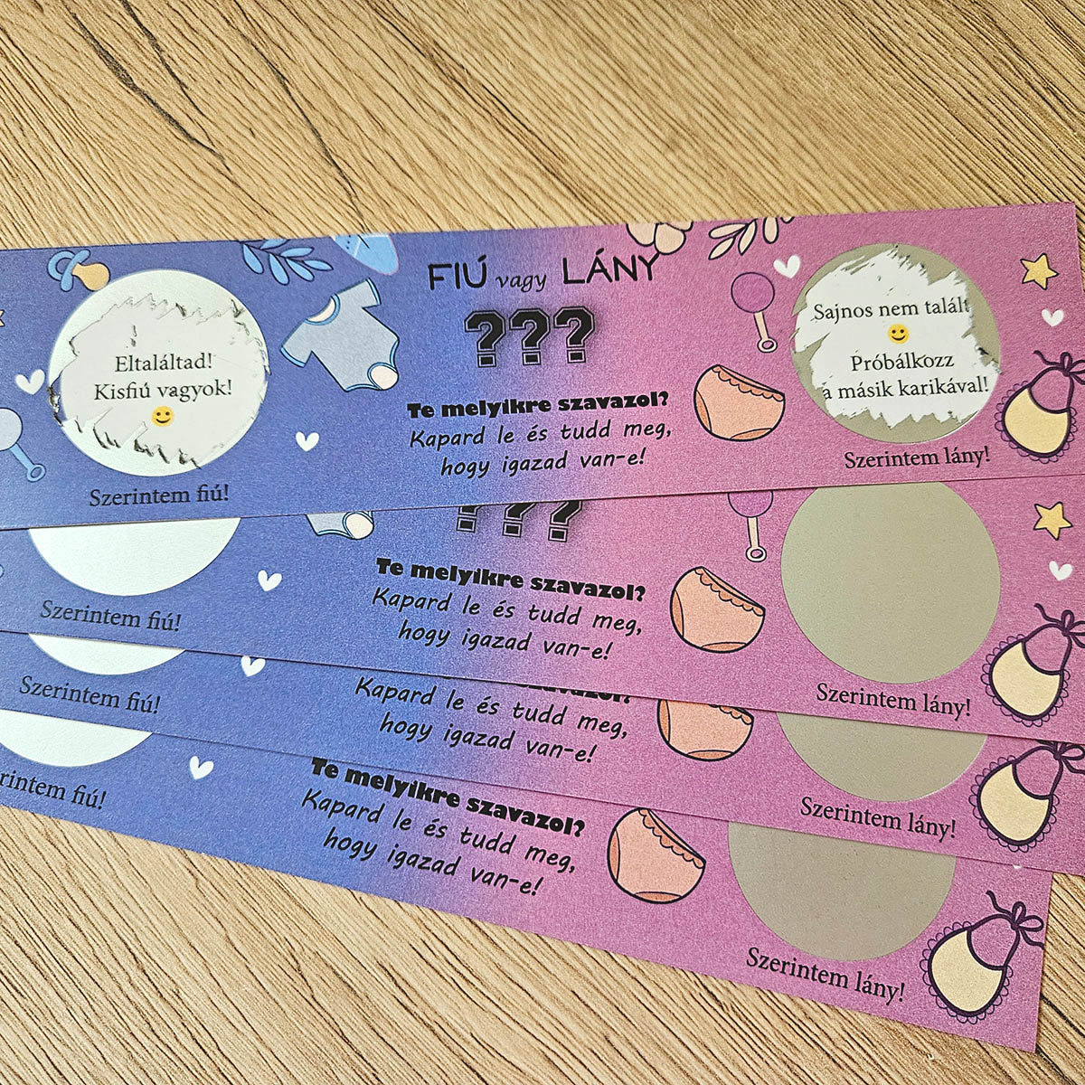 Biztosan mindenki határozottan tudja, érzi, tippeli. A baba nemének bejelentő buliján, vagy családi összejövetelen add a kezükbe ezt a nembejelentő kaparós sorsjegyet! Most izgalmas kapargatás közben jelenthetitek be, hogy ki találta el a baba nemét!