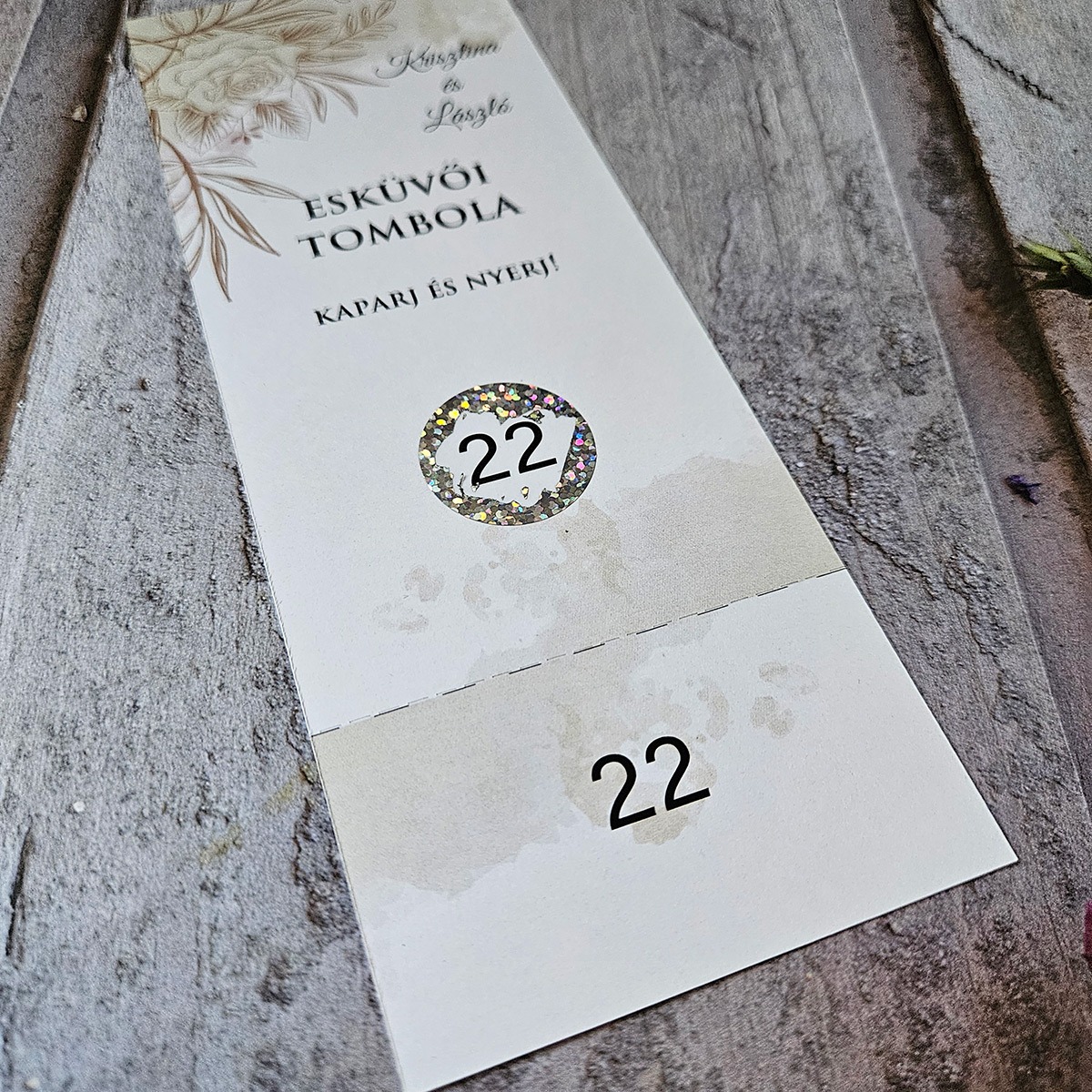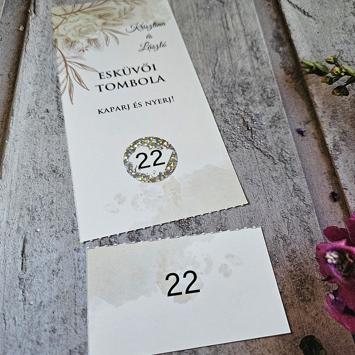 Az alján letéphető pótszámokkal: Igény szerint az alsó részt perforáljuk, így Te tépheted le azokat és mehet is a kalapba a számhúzáshoz. Így Te láthatod, mi van a kaparós felület alatt. Biztos lehetsz benne kihez melyik szám kerül (pl. ha a vendégasztalon kihelyezitek, így akár kontrollálhatod is a sorsolás menetét és a kihúzott ajándék is jó helyre kerülhet.