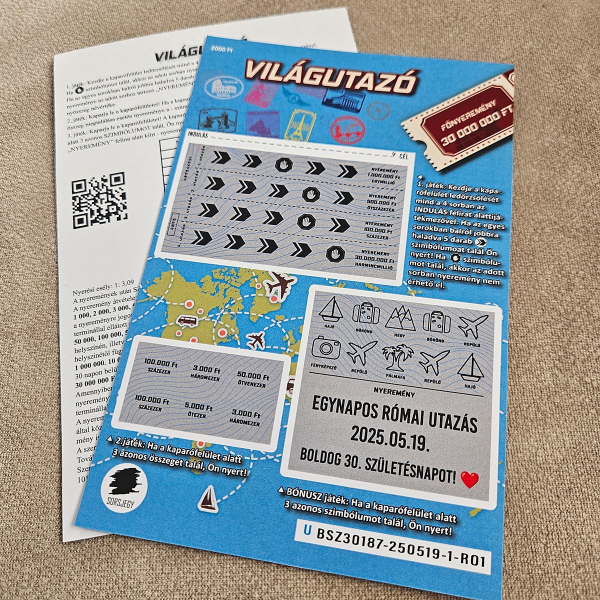 Szeretnél egy repülőjegyet vagy egy álomnyaralást átadni, de a boríték túl snassz? A Világutazó valósághű egyedi kaparós sorsjegy a legújabb, 2025-ös fejlesztésű termékünk, amely Magyarországon egyedülálló technológiával készül. Olyan kézbe fogni és olyan lekaparni, mint az igazit – a gyanakvás kizárva! 🌍🎰